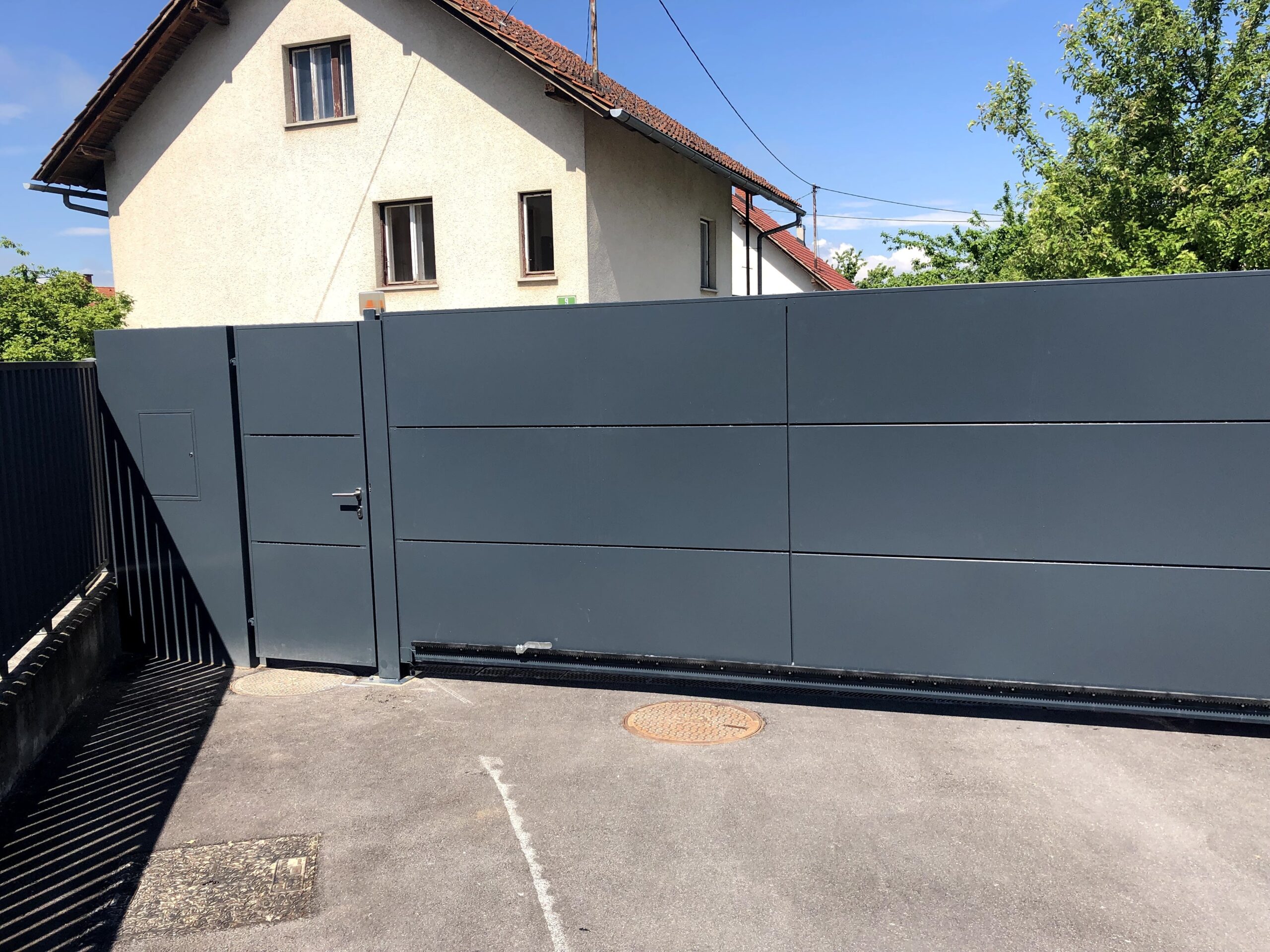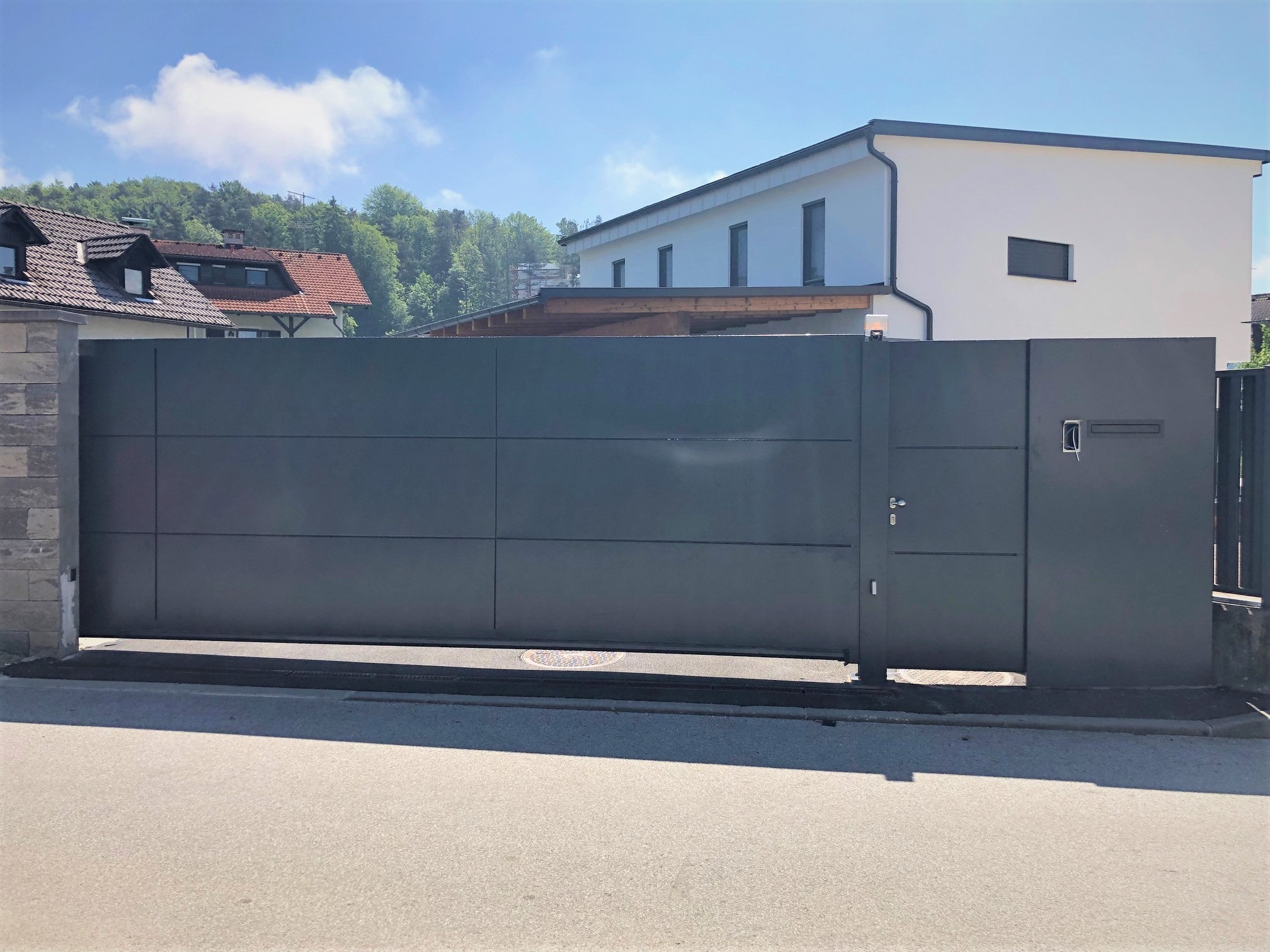 Dvoriščna vrata K-Haus zagotavljajo učinkovito zaščito pred nepooblaščenim dostopom, saj so izdelana iz vzdržljivih in robustnih materialov. Možna je integracija pristopnih sistemov, ki omogočajo dodatno varnost in nadzor dostopa.